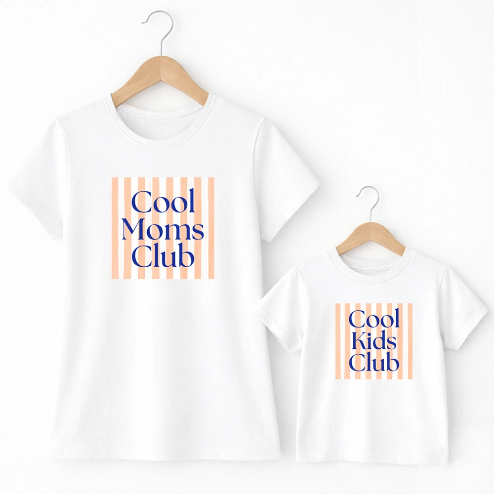 Koszulka dla mamy z napisem „Cool Moms Club” oraz dla dziecka „Cool Kids Club” tworzą spójny, uroczy duet, który przyciąga spojrzenia i wywołuje uśmiech.