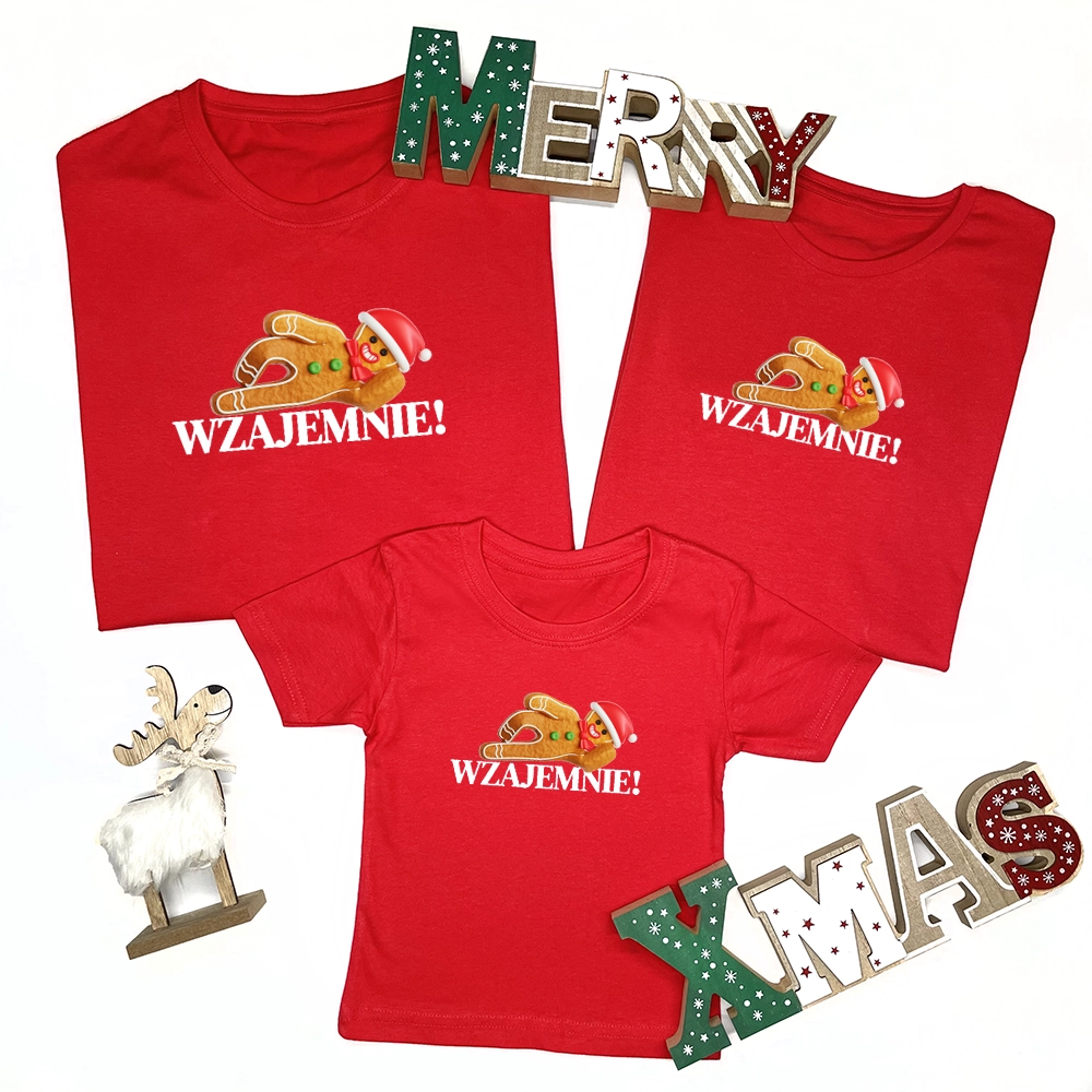 Świąteczne, koszulki dla mamy, taty i dziecka (dla najmłodszych do wyboru body) to doskonały pomysł stylizacji na sesję świąteczną, a nawet wigilijną kolację. Kolorowy nadruk ciasteczka i nadruk wzajemnie świetnie spełni swoją rolę, jeśli nie lubicie składać świątecznych życzeń.