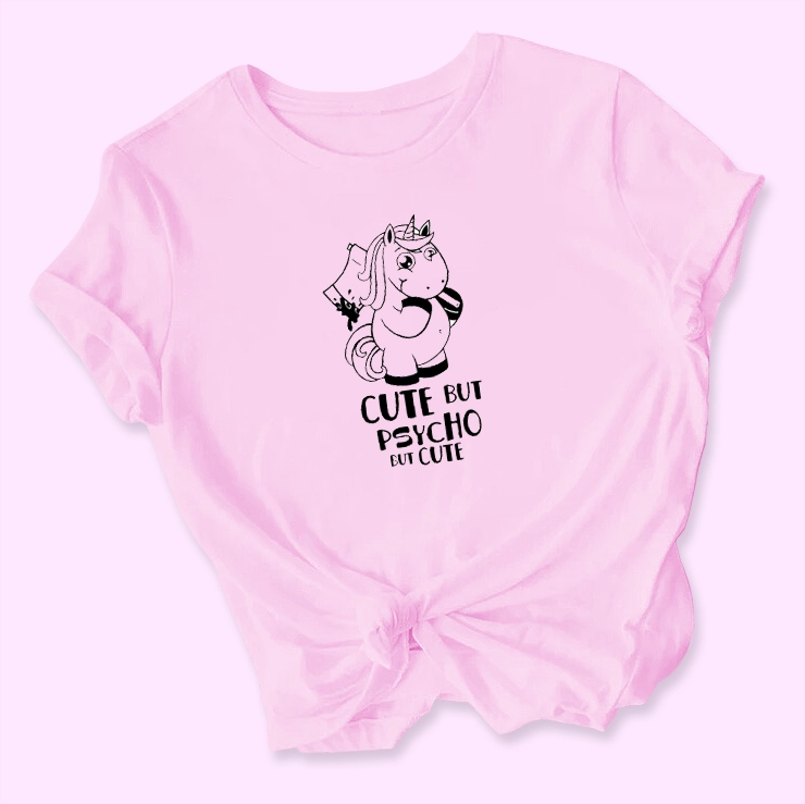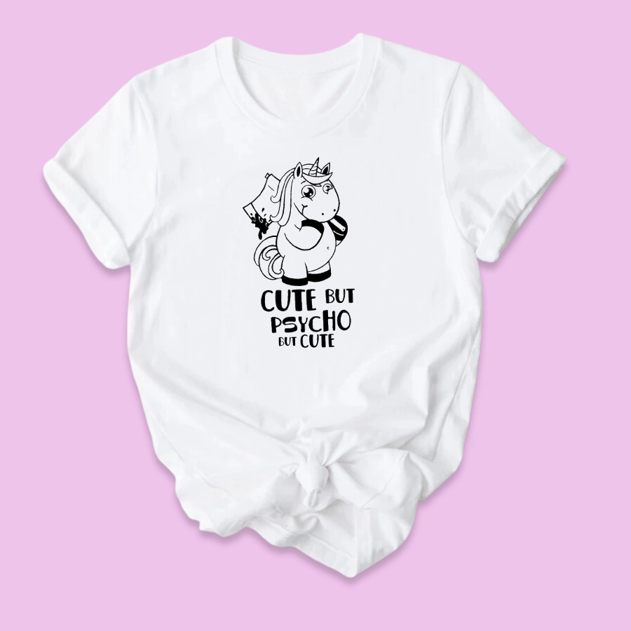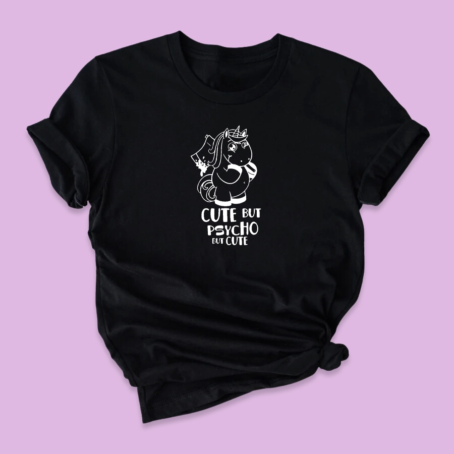 Damska koszulka z zabawnym nadrukiem jednorożca i napisem CUTE BUT PSYCHO BUT CUTE. Idealna jako prezent dla koleżanki, na Dzień Kobiet czy urodziny. Świetna do stylizacji na co dzień.