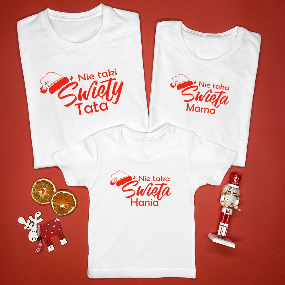 Zestaw koszulek dla mamy, taty i dziecka na Boże Narodzenie z nadrukiem Nie taki Święty/Święta