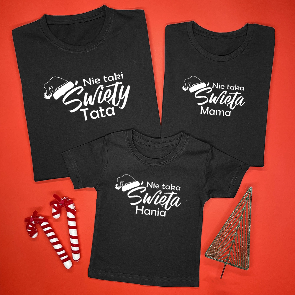 Nie taki święty komplet świątecznych koszulek dla rodziców i dziecka z imieniem