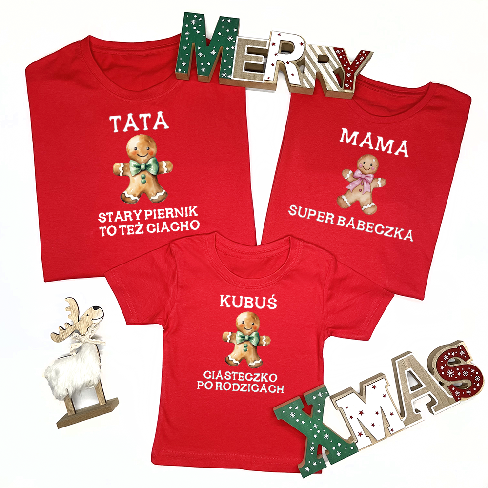 Świąteczne, personalizowane koszulki dla mamy, taty i dziecka to doskonały pomysł stylizacji na sesję świąteczną, a nawet wigilijną kolację. Kolorowy nadruk pierniczków i Waszymi imionami sprawi, że Święta będą jeszcze bardziej magiczne!