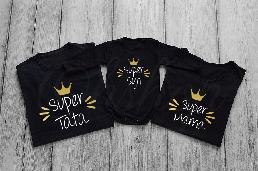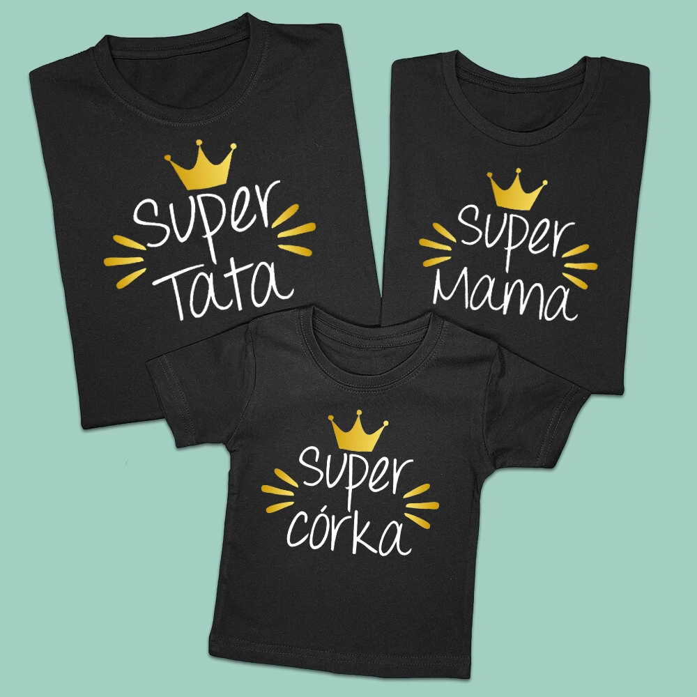 Komplet rodzinnych koszulek lub body dla dziecka z nadrukiem super mama, super tata, super syn, super córka z koroną