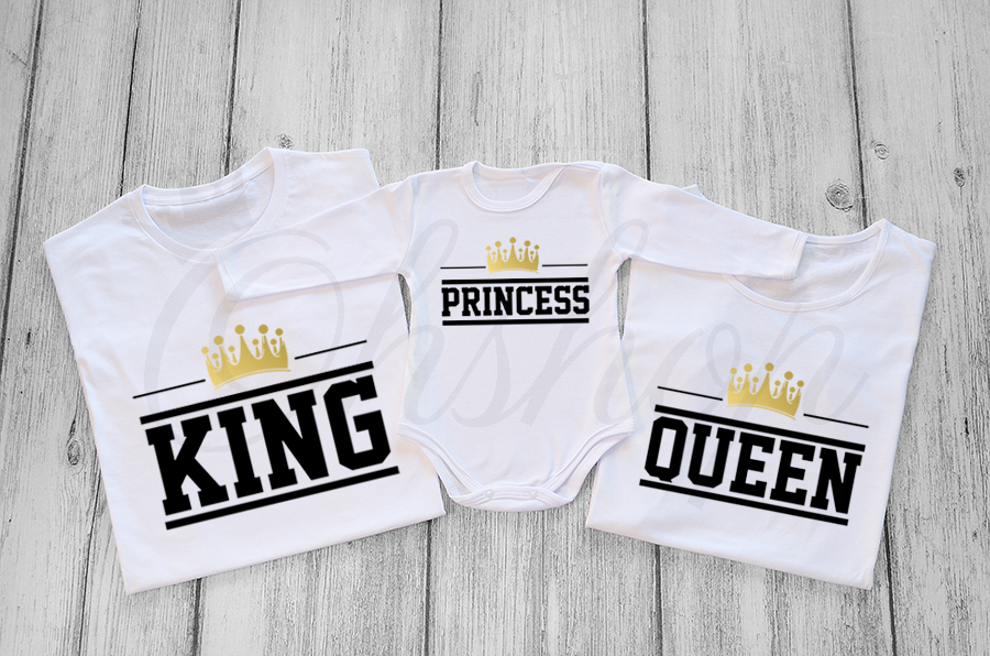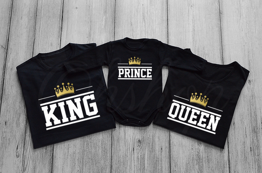 Komplet koszulek lub body dla dziecka z królewskim nadrukiem i koroną. Jednakowe koszulki dla rodziców i dziecka to doskonały pomysł stylizacji na sesję zdjęciową, rodzinne wakacje czy długie spacery! W takich samych ubraniach z pewnością wyróżnicie się z tłumu. Koszulki z nadrukiem sprawdzą się jako prezent na baby shower, urodziny, imieniny czy Święta Bożego Narodzenia.